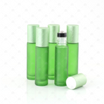 Contents: Set of 5 10ml Frosted Glass Roller Bottles, Premium Stainless Steel Rollers and Metallic Caps.