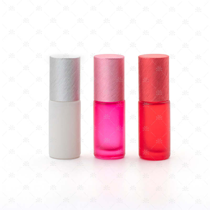 Contents: Set of 3 5ml Frosted Glass Roller Bottles, Premium Stainless Steel Rollers and Metallic Caps, including 5ml Frosted Pink Roller Bottle and Pink Metallic Cap, 5ml Frosted Red Roller Bottle and Red Metallic Cap, and 5ml Matte White Roller Bottle and Silver Metallic Cap
