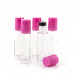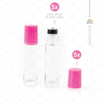 Contents: 5 x 10ml clear bottles with tutu (pink) cap and new style stainless steel rollerballs