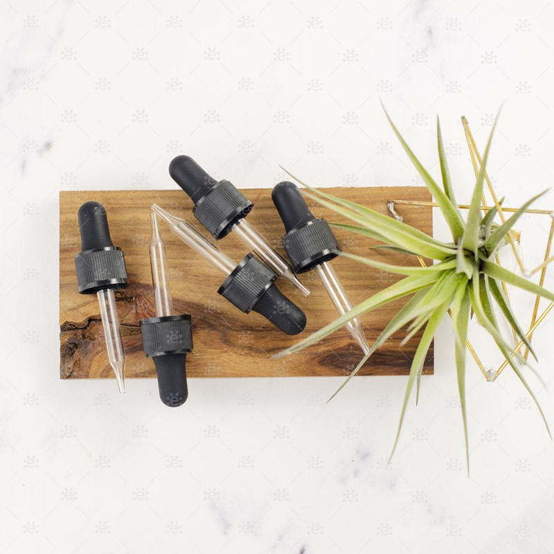 Contents: 5 x 10ml pre-assembled dropper caps—including glass pipettes, rubber bulbs, and plastic caps. (oil bottles not included, for illustration purposes only)