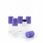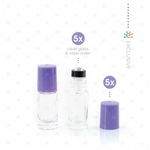 Contents: 5 x 5ml clear bottles with amethyst (purple) cap and new style stainless steel rollerballs