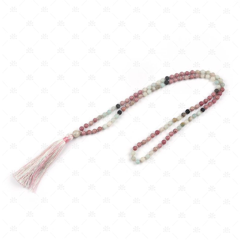 This gorgeous gemstone necklace is made from Amazonite and Rhodochrosite gemstones, both known to carry beneficial properties and meaning, along with volcanic absorbent black lava stones to apply your essential oils on. Decorated with a coordinated tassel to finish off this beautiful piece.